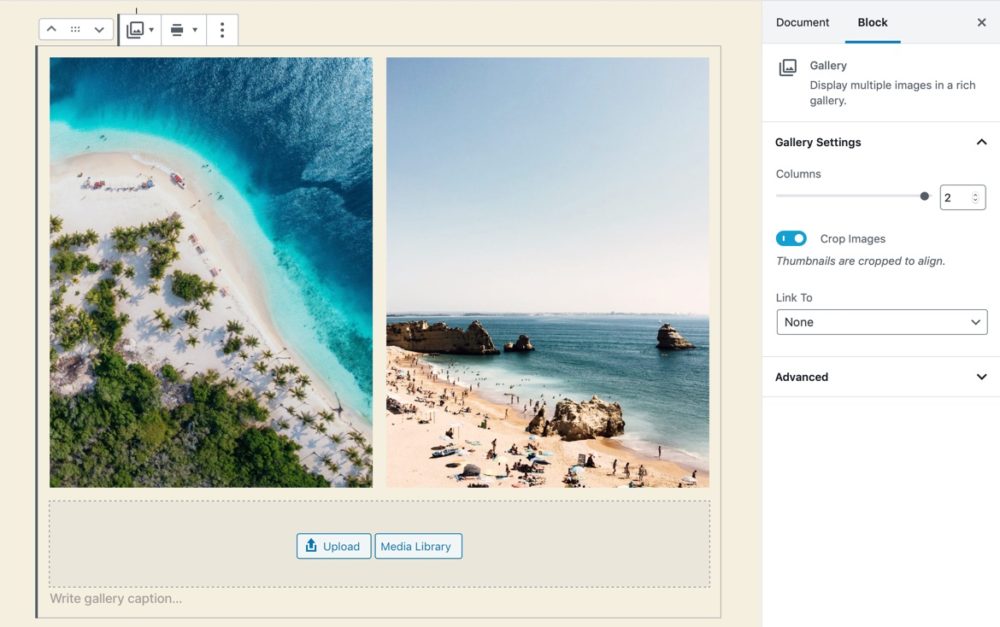 - Adjust the block settings to change the number of columns and whether to crop the images in the gallery.