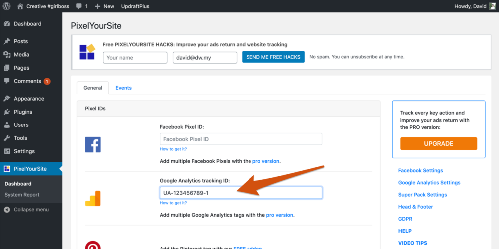 Install Google Analytics tracking code with the PixelYourSite plugin